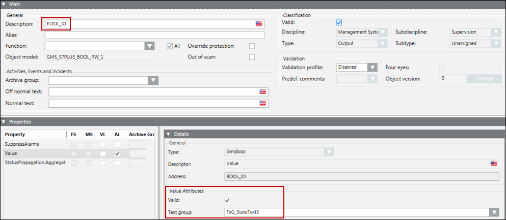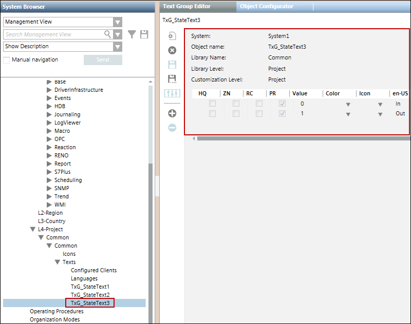 StateText | Name der Textgruppe Diese Textgruppe kann entweder aus der Liste der im Abschnitt Texte definierten Textgruppen oder aus den im System vorhandenen Textgruppen kommen. Dieses Feld gilt nur für BOOLE- und ENUM-Datentypen. |