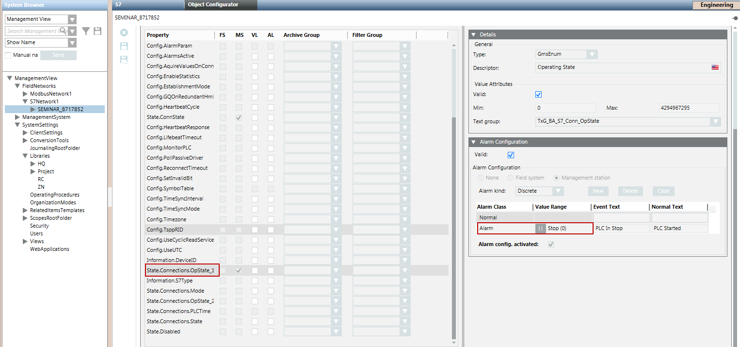 Über die Eigenschaft State.Connections.OpState_1 können Sie Alarme für S7 PLUS Geräte konfigurieren.