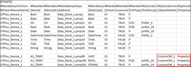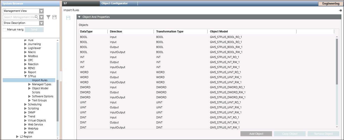 ObjectModel | Objektmodell des Punkts. Sie müssen in diesem Feld keinen Wert angeben, wenn Sie S7 PLUS-Punkte mit nativen Objektmodellen importieren. Wenn Sie jedoch S7 PLUS-Punkte mit N-zu-1-Abbildung importieren, müssen Sie den Wert des Objektmodells und der Eigenschaft angeben. Bevor Sie einen Namen angeben, müssen Sie sicherstellen, dass im System ein Objektmodell definiert ist. Weitere Informationen zur Erstellung von Objektmodellen finden Sie unter Objektmodelle erstellen |