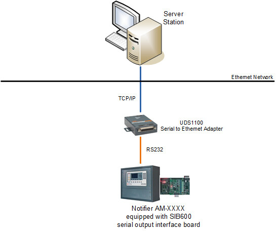 Die Notifier Brandmeldezentralen AM-2000Nm, AM-4000 und AM6000N können mit der Management Station über das TCP/IP-Protokoll durch einen RS232-Ethernet-Konverter kommunizieren, der die Datenübertragung für Zentralen ermöglicht, die mit der seriellen Ausgangsschnittstellenkarte SIB600 ausgestattet sind.