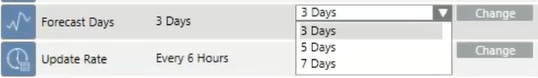 - Wählen Sie im Register Bedienung neben der Eigenschaft Vorhersagetage den Vorhersagezeitraum aus der Dropdown-Liste aus (3 Tage, 5 Tage oder 7 Tage) und klicken Sie Ändern.