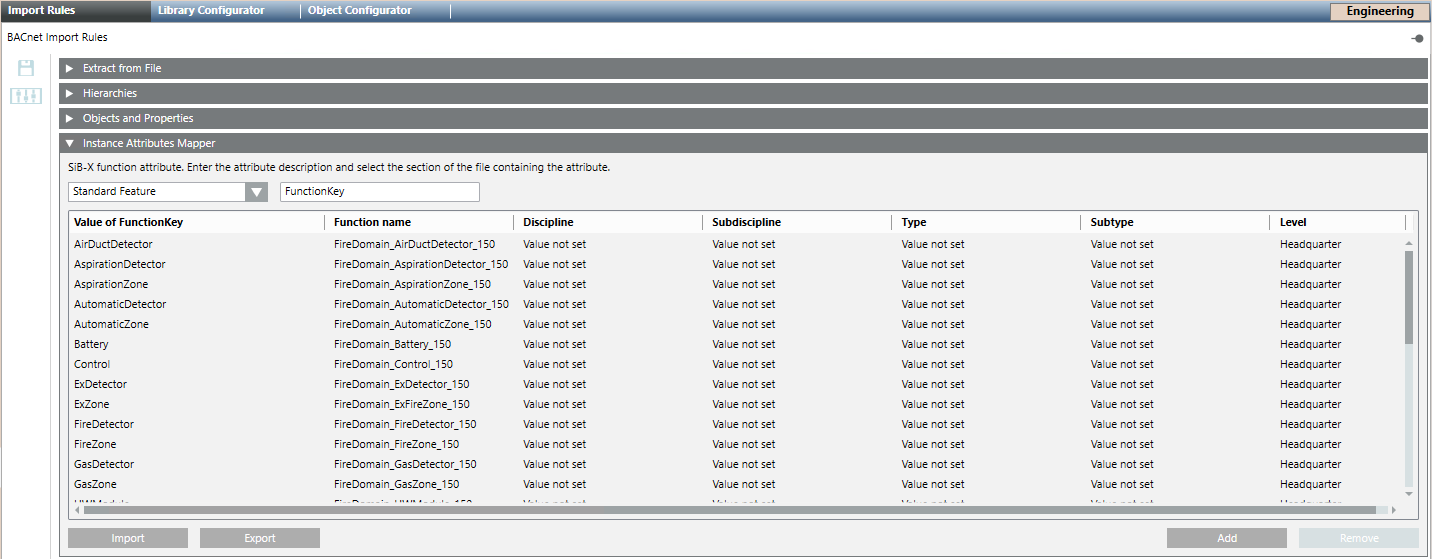 - Wählen Sie Projekt > Systemeinstellungen > Bibliotheken > L1-Headquarter > GA > Gerät > BACnet > Importregeln.