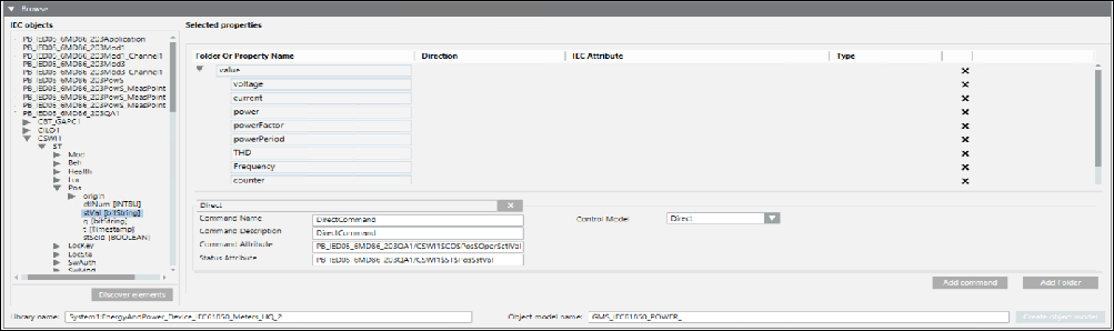 - Die Informationen der IEC61850 Geräteobjekte und deren zugehörige Eigenschaften werden in einer Struktur in der IEC-Objektliste angezeigt. Der Abschnitt Ausgewählte Eigenschaften wird aktualisiert und zeigt die Ordnerstruktur für die Gruppierung der zugehörigen Eigenschaften des Objektmodells und andere Spalten an, z.B. Eigenschaftsname, Richtung, IEC-Attribut und Typ.