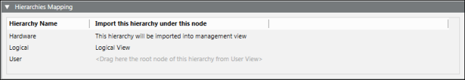 Diese Hierarchie importieren unter. | Zeigt die Importregel für die Hierarchie an (z.B. wurde die Hierarchie Hardware der Managementsicht zugewiesen). Sie müssen den gewünschten Basisordner für die Technische Sicht und die benutzerdefinierte Sicht zuweisen. Wählen Sie hierzu in der Dropdown-Liste System Browser die Sicht und ziehen Sie den Basisordner der Sicht auf das vorgeschlagene Feld. |