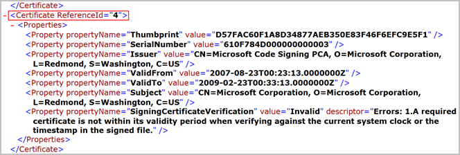 Ist SigningCertificateVerification ungültig, wird der Wert (Grund) angezeigt.