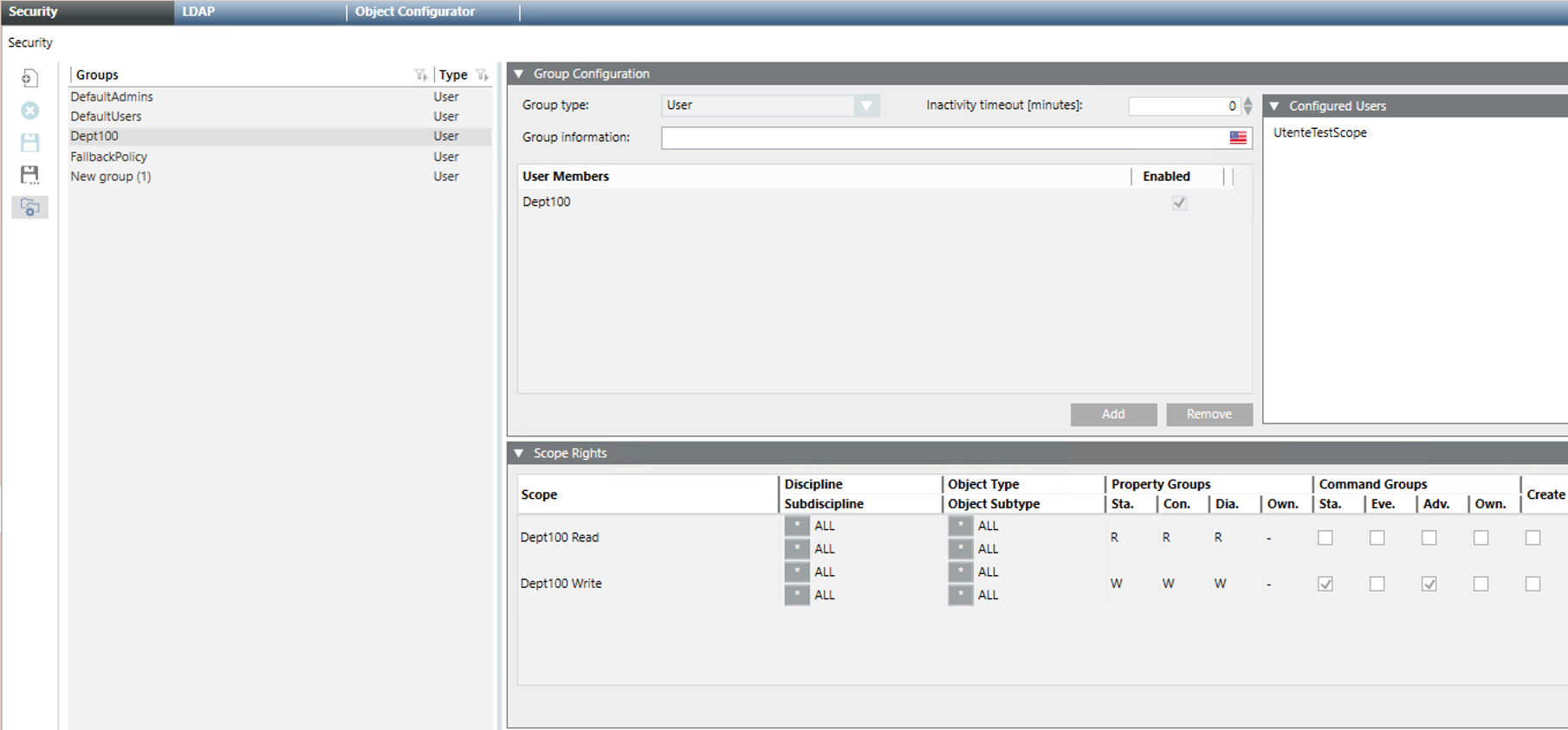 Wählen Sie in der Liste Gruppen die zuvor konfigurierte Benutzergruppe für Scripts aus. Zum Beispiel, Dept100User.