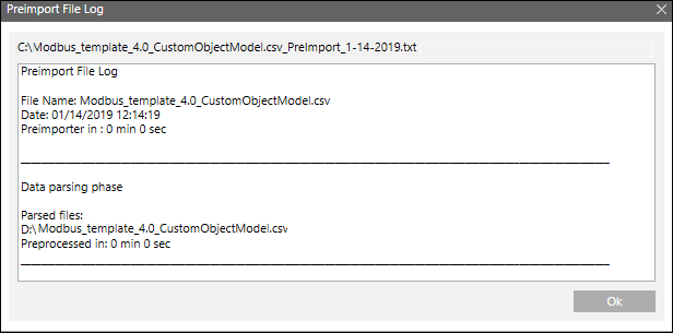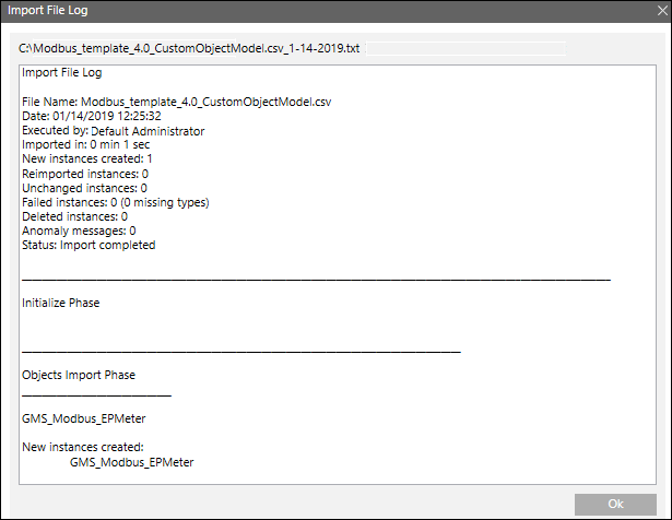 - (Optional) Klicken Sie Log öffnen, um die Protokolldatei des Imports zu betrachten. Die Einzelheiten werden im Dialogfeld Dateilog importieren angezeigt. Diese Schaltfläche ist nur aktiviert, wenn der Importvorgang abgeschlossen wurde.