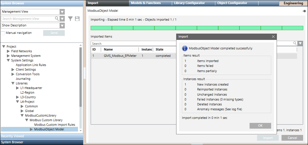 - Eine Meldung fordert Sie auf, den Import der gewählten Objekte zu bestätigen.