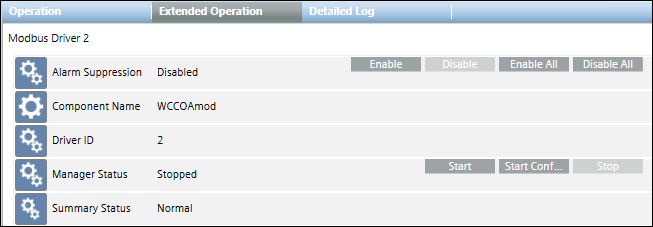 Wenn Sie in der Struktur des System Browsers den Ordner Modbus-Treiber (im Konfigurations-/Bedienmodus) wählen, werden in den Registern Bedienung/Erweiterte Bedienung Befehle (Start und Stopp) angezeigt, mit denen Sie den Treiber starten bzw. stoppen können. Der Befehl Stopp wird nur bei laufendem Treiber aktiviert; wenn der Treiber nicht ausgeführt wird oder ein Vorgang in Bearbeitung ist, ist dieser deaktiviert.