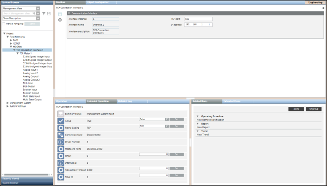 Im System Browser enthält jedes Modbus-Netzwerk eine Reihe von Modbus-Schnittstellen und jede dieser Schnittstellen enthält die mit ihr verbundenen Geräte und Punkte.