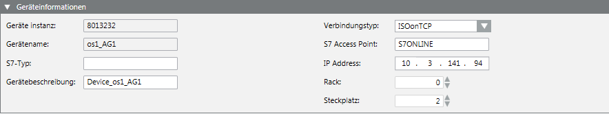 Dieser Expander zeigt die Einstellungen für die S7-Gerätedaten. Sie können die Geräteinstanz (numerische ID des S7-Geräts) und Gerätename (Name des S7-Geräts) anzeigen und folgende Parameter bearbeiten: - S7-Typ (S7-CPU-Typ)