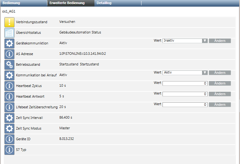 Wenn Kommunikation bei Anlauf =Inaktiv: Das Gerät startet die Kommunikation nie, wenn der Treiber startet, auch wenn Gerätekommunikation =Aktiv. Um mit dem S7-Gerät kommunizieren zu können, muss Gerätekommunikation wieder aufAktivgesetzt werden.- Heartbeat-Zyklus