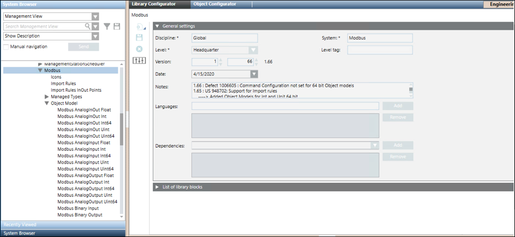 Modbus-Standardobjektmodelle befinden sich unter Managementsicht > Systemeinstellungen > Bibliotheken > L1-Headquarter > Global > Modbus.