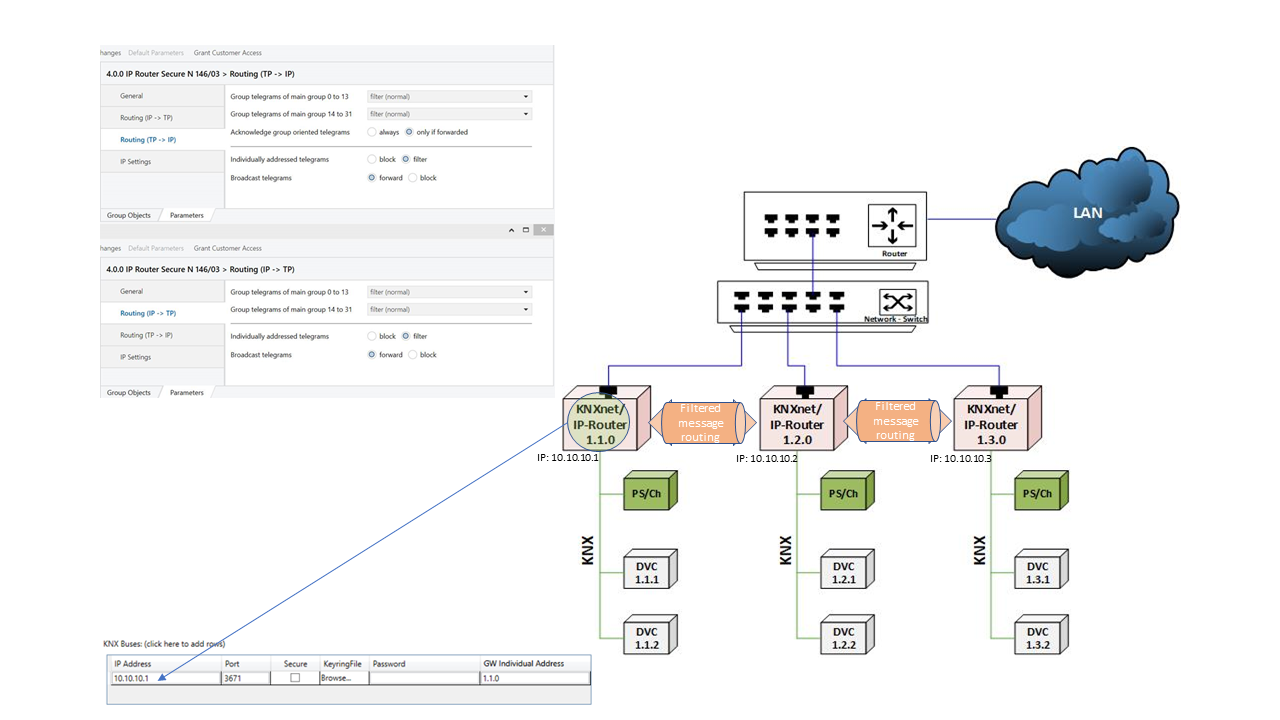 - Wenn das gefilterte Nachrichten-Routing auf den KNXnet/IP-Routern aktiviert ist, muss im KNX-Adapter nur ein KNXnet/IP-Router konfiguriert werden.
