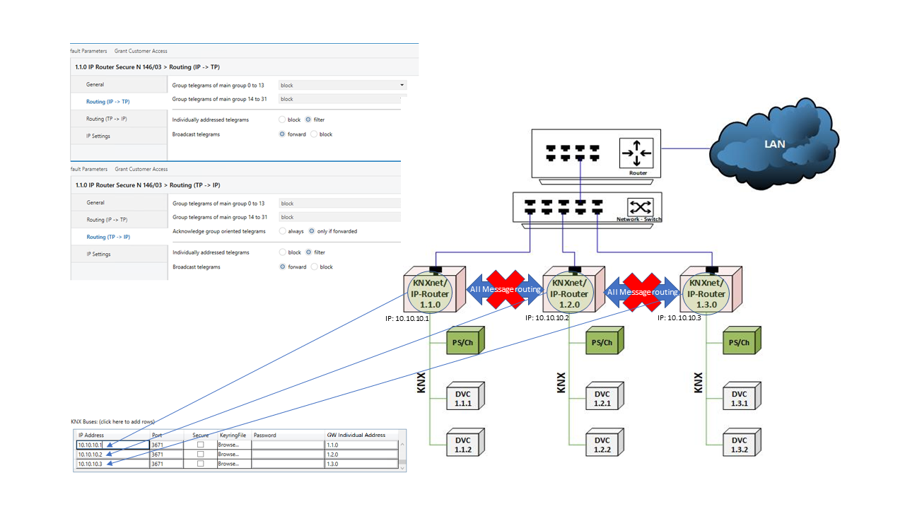 - KNX-Installation mit separaten, unabhängigen KNX-Leitungen, die kein Multicast-Routing zwischen KNX-Leitungen verwenden.