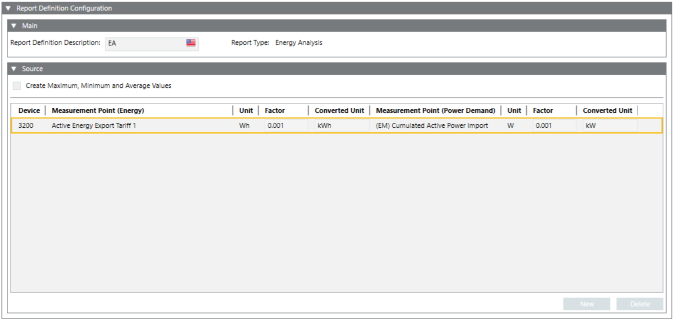 Geben Sie in den folgenden Spalten Werte ein: a. Wählen Sie aus der Dropdown-Liste in der Spalte Messpunkt(Energie) den erforderlichen Messpunkt aus, für den Berichte erstellt werden sollen. Hinweis: Sie können nur ein Gerät konfigurieren und einen Energieanalysebericht erstellen. b.Einheit c.Faktor d.Umgerechnete Einheit: e. Wählen Sie aus der Dropdown-Liste in der Spalte Messpunkt(Strombedarf) den Messpunkt, für den der Bericht erstellt werden soll. f.Einheit g.Faktor h.Umgerechnete Einheit