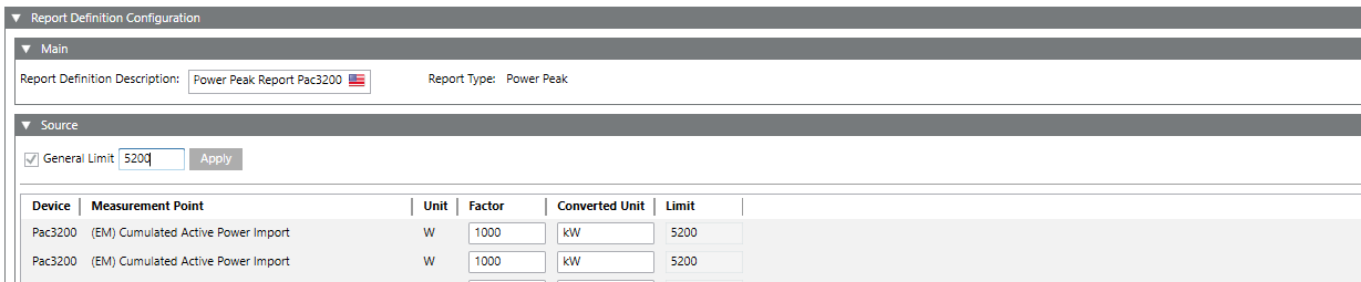 Geben Sie in den folgenden Spalten Werte ein: a. Wählen Sie aus der Dropdown-Liste in der Spalte Messpunkt den erforderlichen Messpunkt aus, für den der Bericht erstellt werden soll. b.Einheit c.Faktor d.Umgerechnete Einheit: e.Grenze