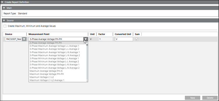 Geben Sie in den folgenden Spalten Werte ein: a. Wählen Sie aus der Dropdown-Liste in der Spalte Messpunkt den erforderlichen Messpunkt aus. b.Einheit c.Faktor d.Umgerechnete Einheit: