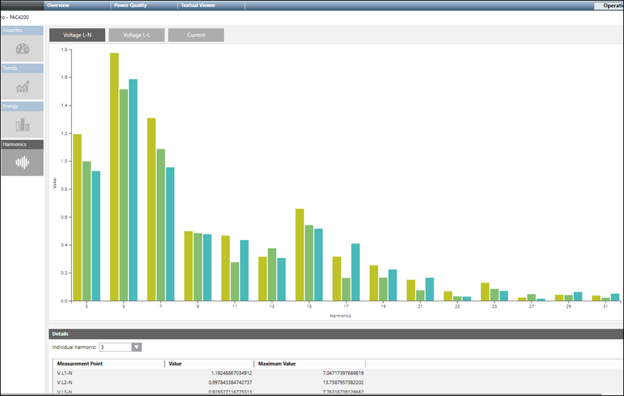 - Spannung L-L: Zeigt die Oberschwingungen der Spannung von Leitung zu Leitung an.