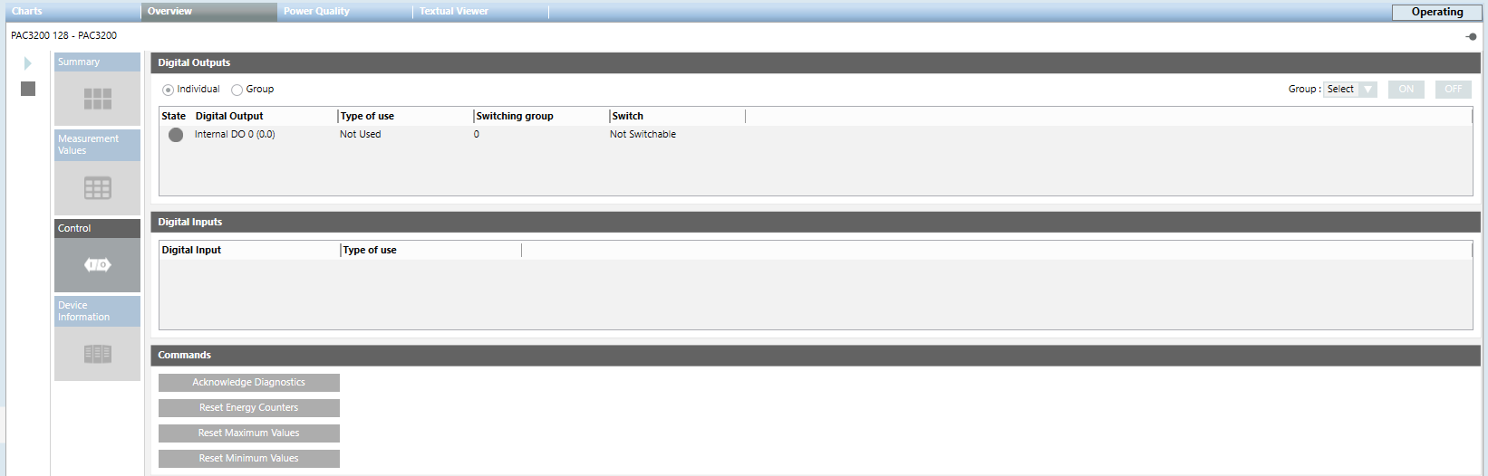 - Digitale Ausgänge Ermöglicht das Umschalten der digitalen Ausgänge der Geräte PAC3200, PAC3200T und PAC4200. Konfigurieren Sie die digitalen Ausgänge dazu als Remote-Ausgang im Gerät. Sie können einen digitalen Ausgang ein- oder ausschalten, indem Sie EIN oder AUS klicken. Der Schaltzustand wird durch folgendes Lampensymbol angezeigt: