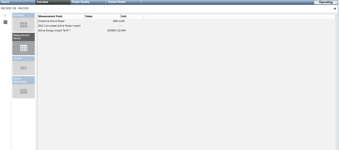 - Messwerte: Bei Auswahl dieser Kachel werden die vorkonfigurierten Messpunkte des gewählten Geräts mit Beschreibung, aktuellem Messwert und definierter Einheit angezeigt.