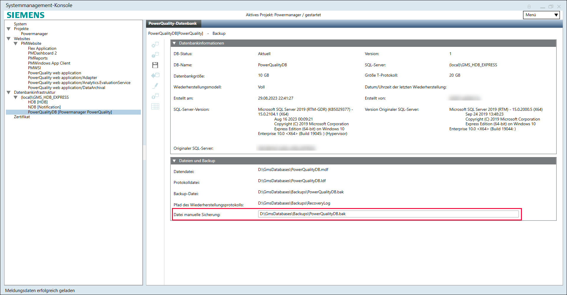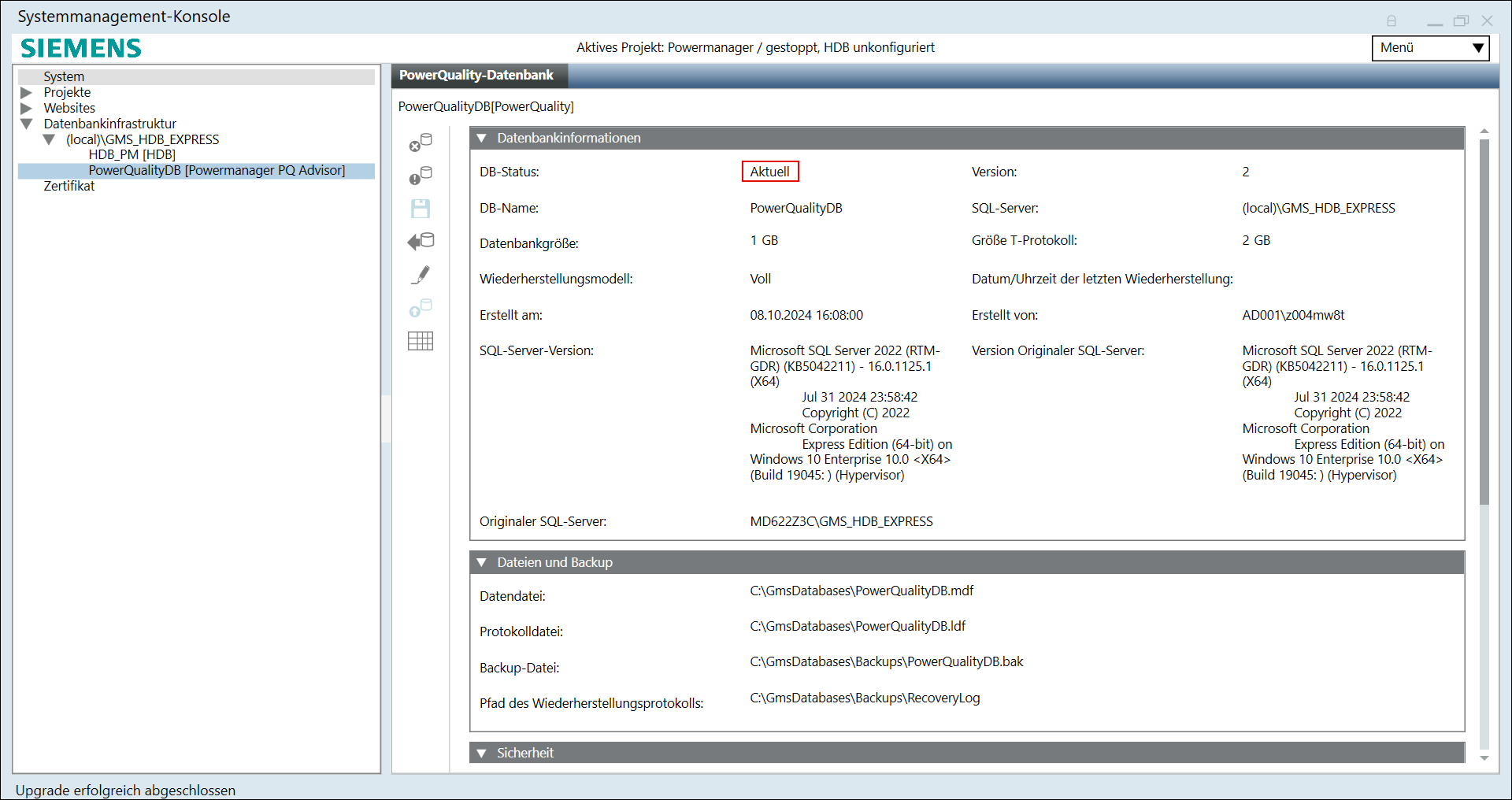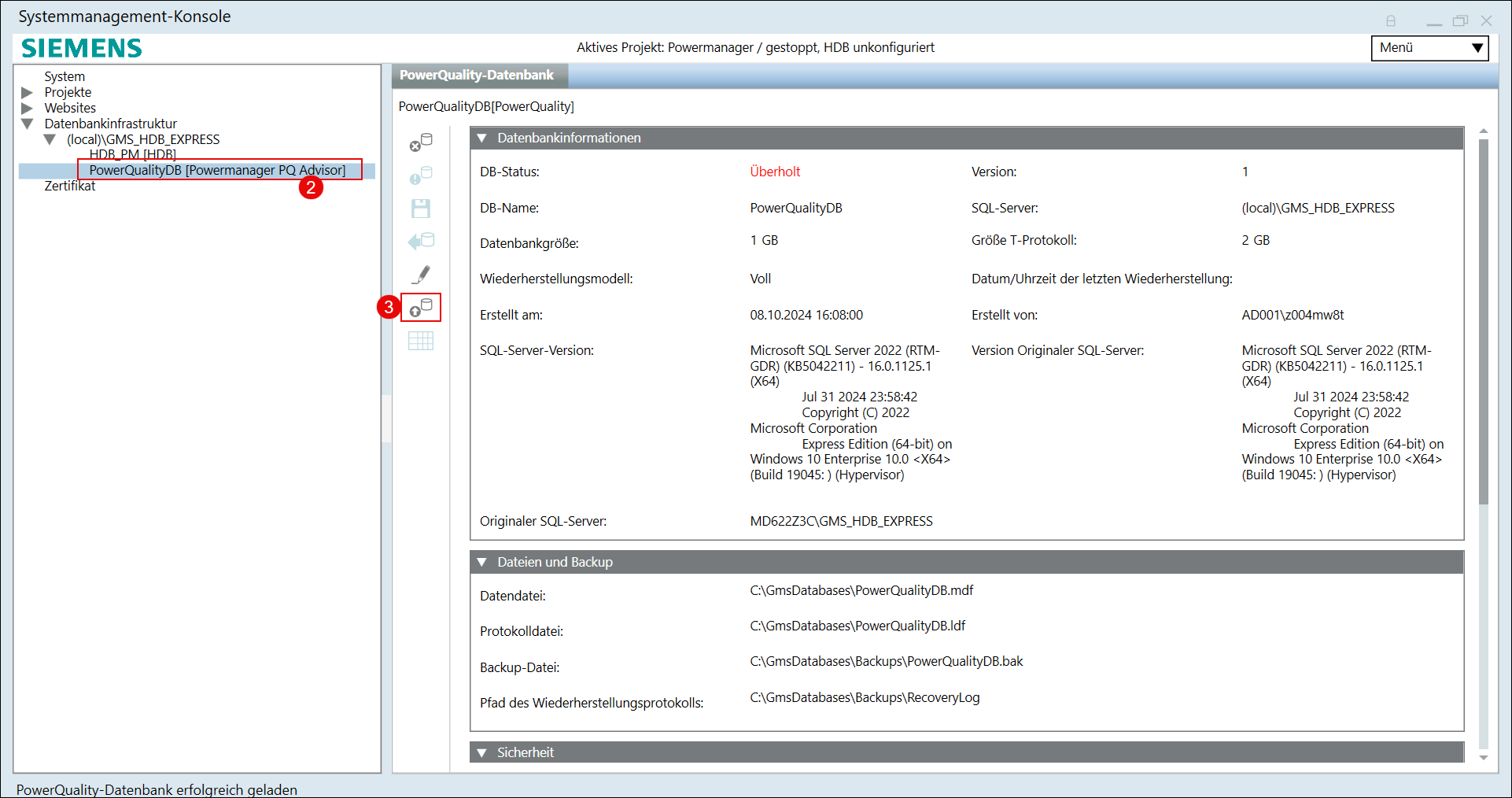 - Die PowerQuality-Datenbank wird nach erfolgreicher Wiederherstellung automatisch gestartet.