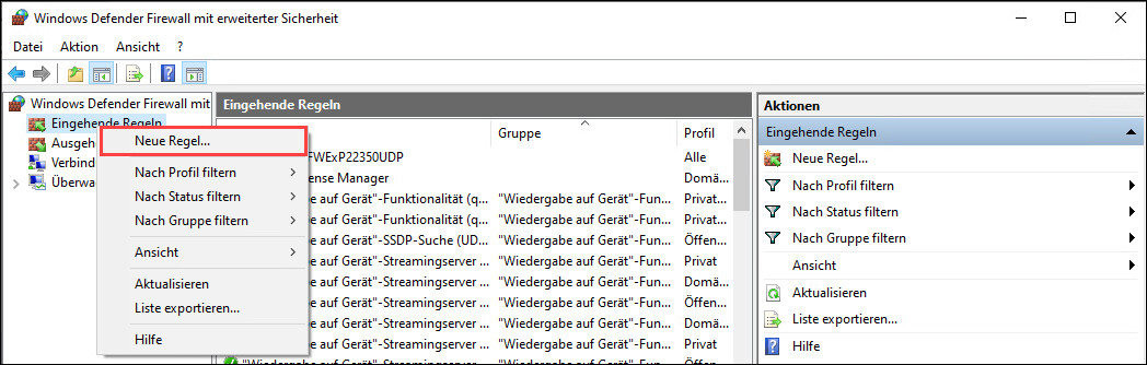 - Klicken Sie mit der rechten Maustaste auf Eingangsregeln und wählen Sie Neue Regel.