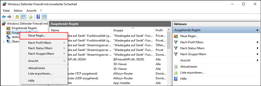 g. Klicken Sie auf Fertigstellen. - Klicken Sie mit der rechten Maustaste auf Ausgehende Regeln und wählen Sie Neue Regel.