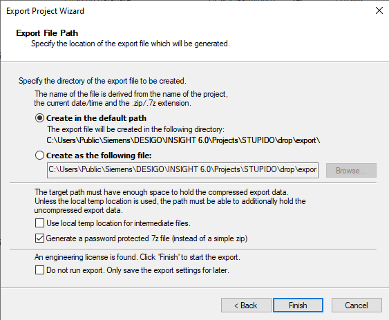- Wählen Sie Im Standardpfad erstellen, um die Exportdatei am Standardspeicherort zu erstellen.