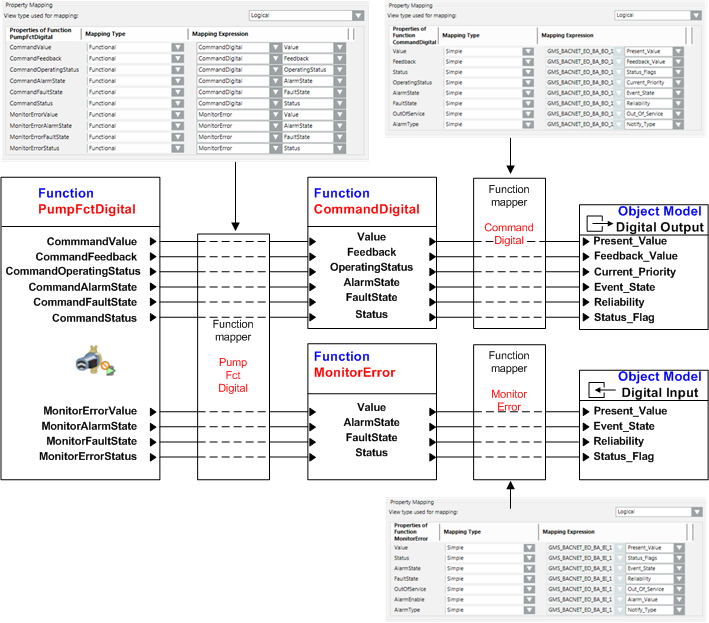 Bei der Funktionsabbildung werden, unabhängig vom Subsystem, mehrere Funktionen für die Darstellung und Bedienung eines Objektes benötigt. Voraussetzung dafür ist, dass die logische Abbildung im System hierarchisch ist. Dies ist z.B. eine Pumpe mit einem digitalen Ein- und Ausgang.