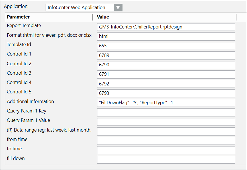 Die Vorlagen- und Steuerungs-IDs sind nicht die gleichen wie im Beispiel unten. Die Werte variieren abhängig vom Benutzer und von den Details der Berichte in der InfoCenter-Datenbank.