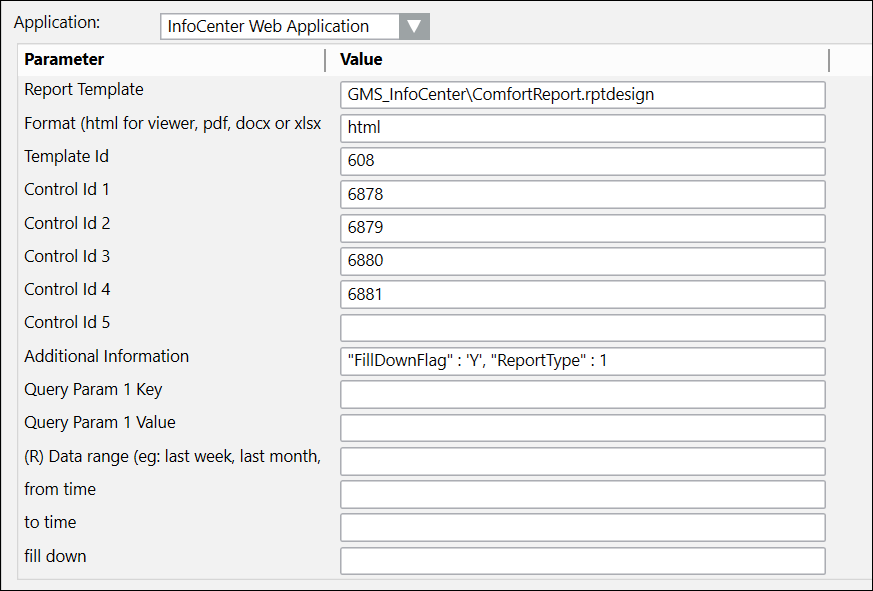 Die Vorlagen- und Steuerungs-IDs sind nicht die gleichen wie im Beispiel unten. Die Werte variieren abhängig vom Benutzer und von den Details der Berichte in der InfoCenter-Datenbank.