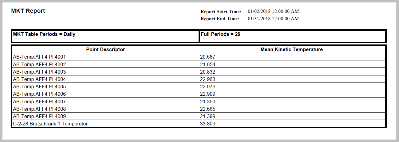 Dieser Bericht zeigt die berechnete, feste Temperatur eines Punkts, die den Effekt von Temperaturschwankungen über einen bestimmten Zeitraum simuliert und ausgehend von einem Info Center MKT-Übersichtspunkt berechnet wird.