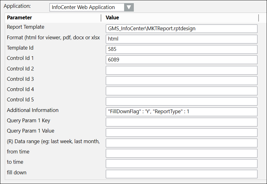 Die Vorlagen- und Steuerungs-IDs sind nicht die gleichen für alle Berichte. Die Werte variieren abhängig vom Benutzer und von den Details der Berichte in der InfoCenter-Datenbank.