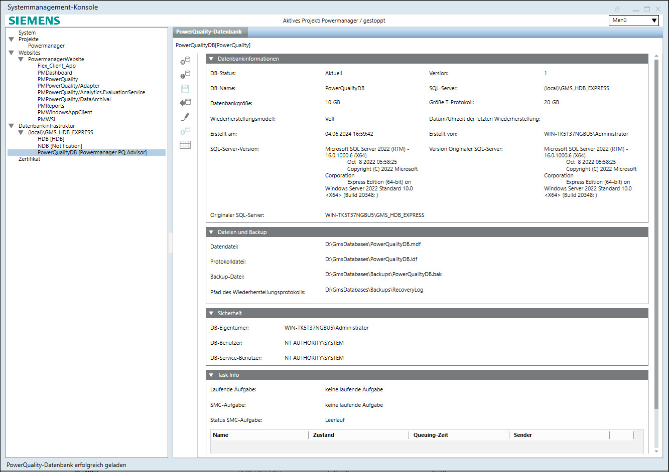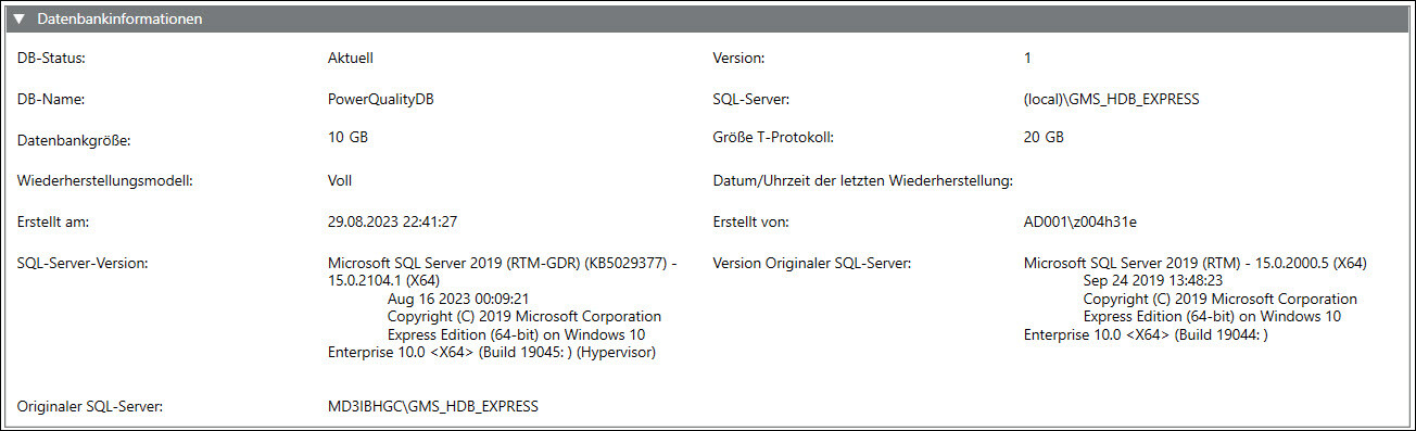 Die Erweiterung der Datenbankinformationen zeigt Informationen über beide PowerQuality-Datenbanken und den SQL-Server an.