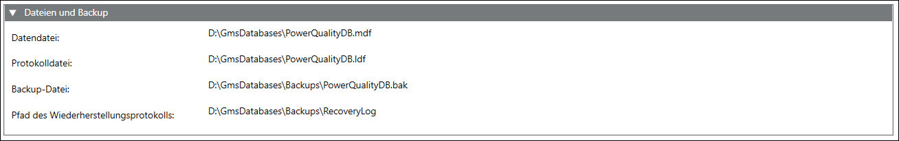 Pfad des Wiederherstellungsprotokolls | Automatisch erstellte Backup-Datei wird unter diesem Pfad gespeichert. Diese Datei kann für die Wiederherstellung der PowerQuality-Datenbank verwendet werden. |