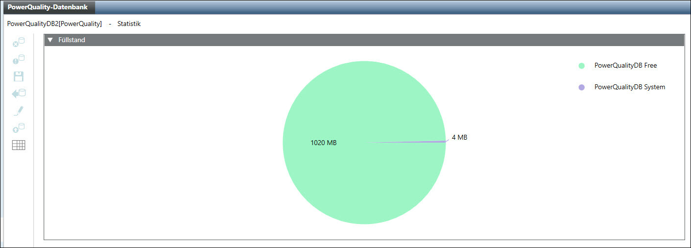 Der Expander Füllstand zeigt den freien und verbrauchten Speicherplatz in der PowerQuality-Datenbank als Kreisdiagramm an.