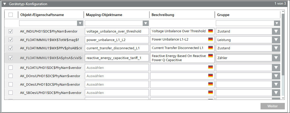 Kontrollkästchen | Ermöglicht die Auswahl des gewünschten Objekts für den aktuellen Gerätetyp. HINWEIS: Aktivieren Sie die Kontrollkästchen für die Eigenschaften, die dem Gerätetyp zugeordnet werden sollen. |