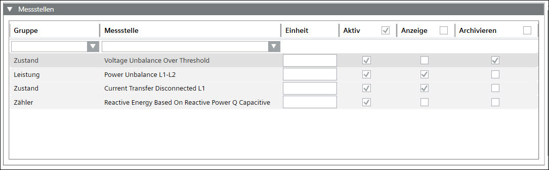 Archiv | Aktivieren Sie das Kontrollkästchen für die Messpunkte, für die Daten archiviert werden sollen. |