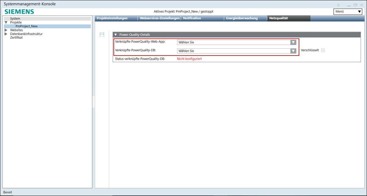 HINWEIS: Um die Verknüpfung der PowerQuality-Webapplikation oder der PowerQuality-Datenbank mit dem Projekt zu lösen, entfernen Sie die Feldwerte Verknüpfte PowerQuality Web App und Verknüpfte PowerQuality DB. Falls nicht beide Werte entfernt werden, kann die Verknüpfung der Webapplikation und der Datenbank mit dem Projekt nicht entfernt werden und es wird eine Fehlermeldung angezeigt.