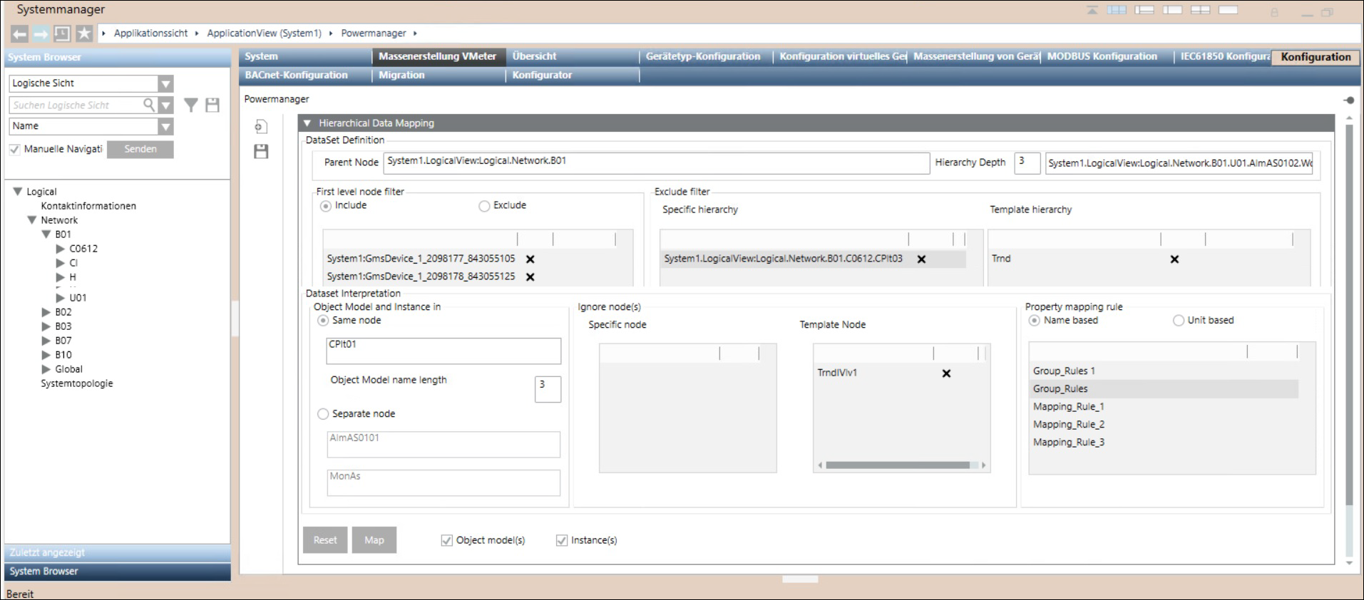 Der Expander Hierarchische Datenzuordnung bietet Optionen, um Powermanager Daten aus dem System Browser zuzuordnen. Diese Daten werden in einem hierarchischen Format dargestellt und als Objektmodelle und Instanzen transformiert, die in einer JSON-Datei gespeichert werden. Diese JSON-Datei wird dann in Powermanager importiert und das Objektmodell und die Geräteinstanzen in der Datei werden als Powermanager-Geräte zugeordnet.