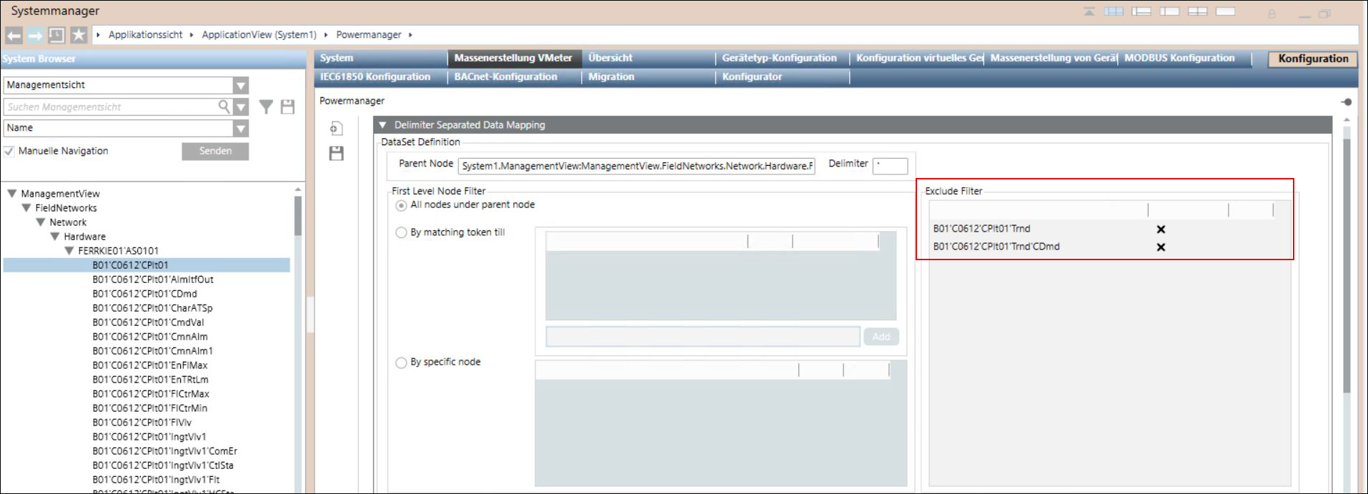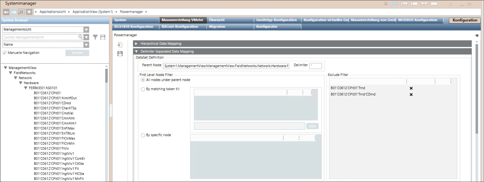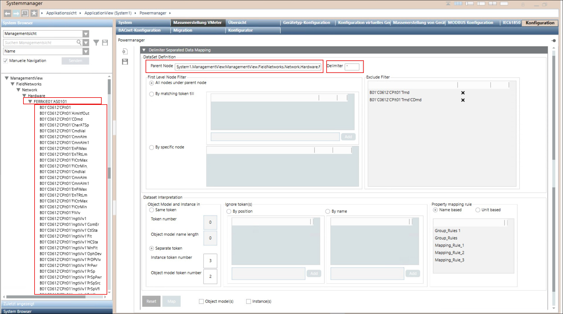 Der Expander Trennzeichengetrennte Datenzuordnung bietet Optionen, um Powermanager die Daten aus dem System Browser zuzuordnen. Unter Trennzeichengetrennte Datenzuordnung werden Daten aus der Verwaltungsansicht in Form einer flachen Struktur dargestellt und durch Trennzeichen wie (') getrennt. Die als Objektmodelle und Instanzen zugeordneten Daten aus dem System Browser werden in einer JSON-Datei gespeichert. Diese JSON-Datei wird dann in Powermanager importiert und das Objektmodell und die Geräteinstanzen in der Datei werden als Powermanager-Geräte zugeordnet.