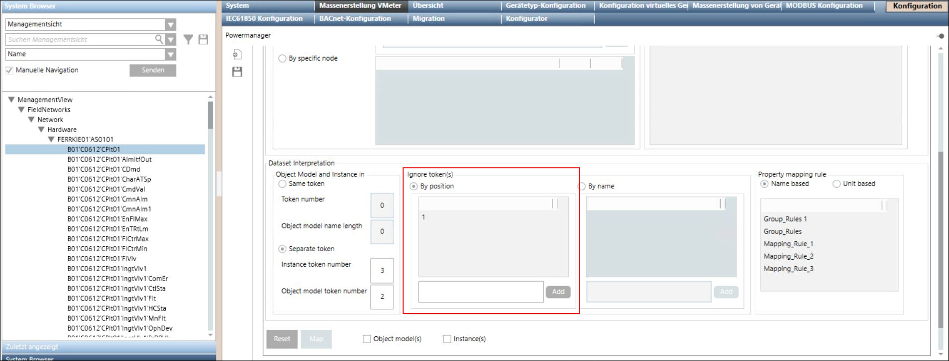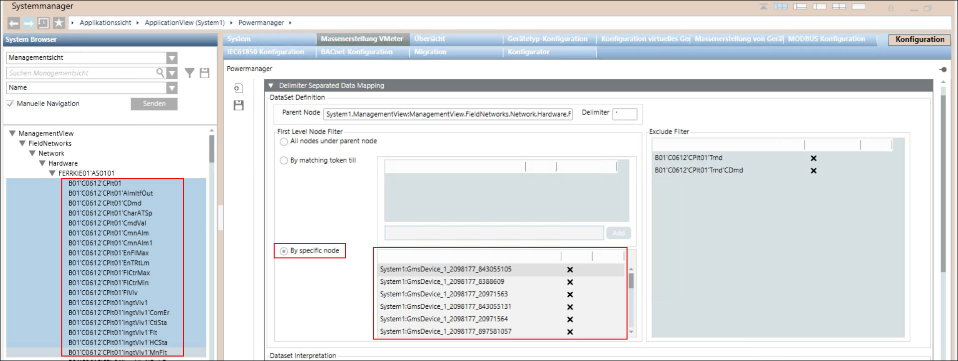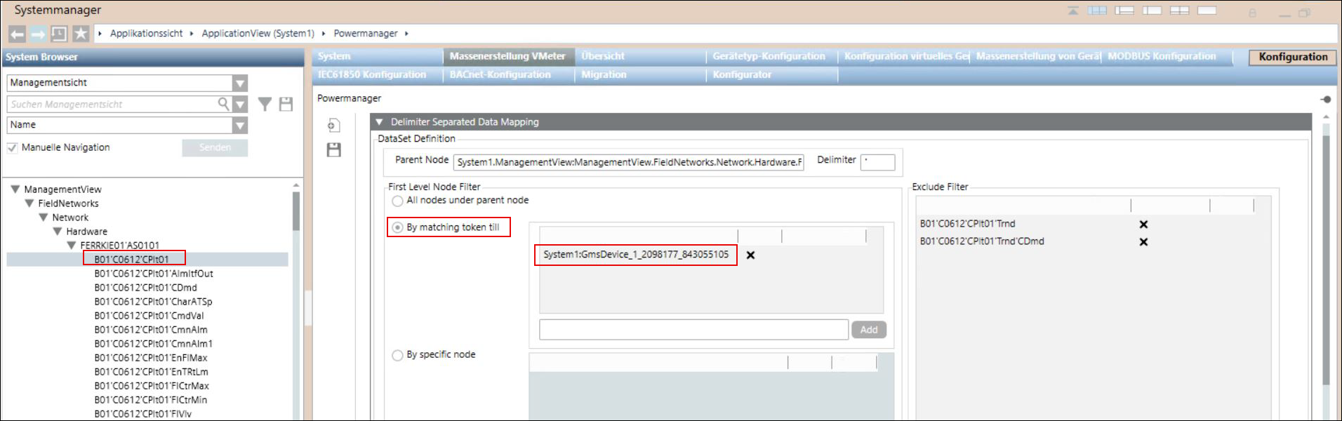 Der Expander Trennzeichengetrennte Datenzuordnung bietet Optionen, um Powermanager die Daten aus dem System Browser zuzuordnen. Unter Trennzeichengetrennte Datenzuordnung werden Daten aus der Verwaltungsansicht in Form einer flachen Struktur dargestellt und durch Trennzeichen wie (') getrennt. Die als Objektmodelle und Instanzen zugeordneten Daten aus dem System Browser werden in einer JSON-Datei gespeichert. Diese JSON-Datei wird dann in Powermanager importiert und das Objektmodell und die Geräteinstanzen in der Datei werden als Powermanager-Geräte zugeordnet.