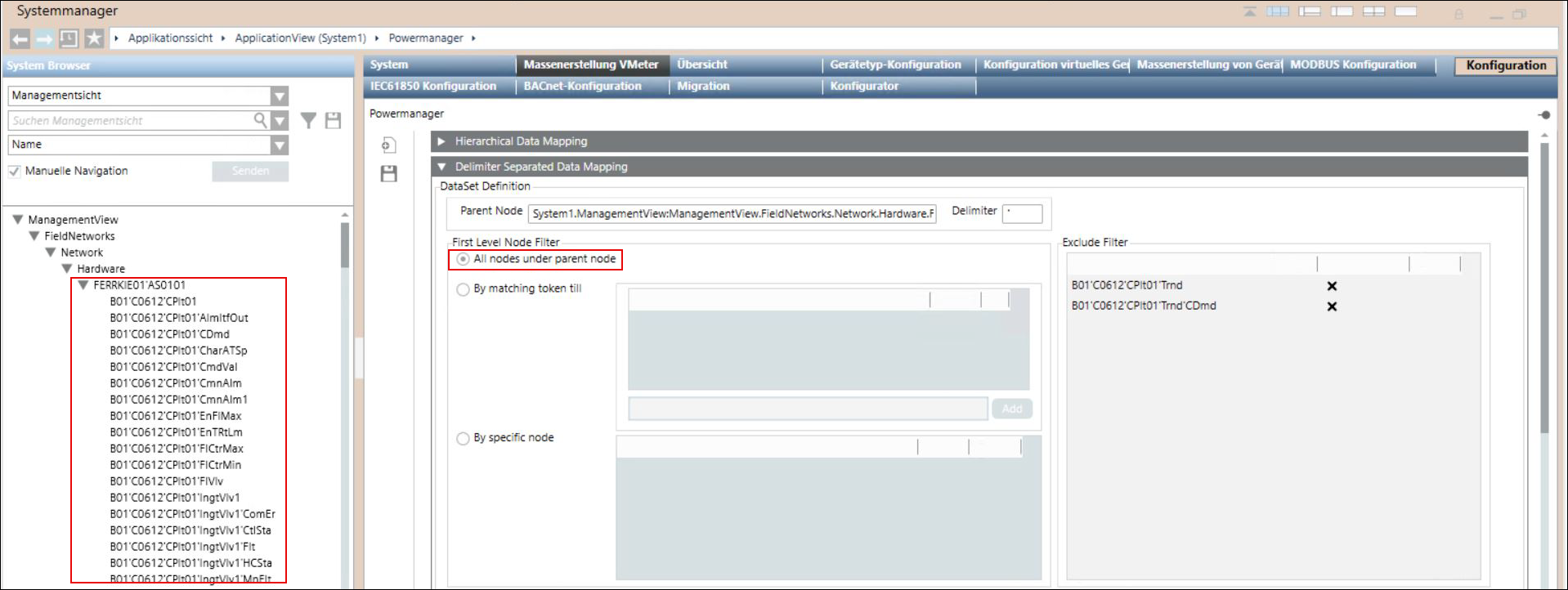 - In der dargestellten Abbildung ist beispielsweise der Knoten FERRKIE01‘AS0101 der übergeordnete Knoten, unter dem das Objektmodell oder die Instanzen erstellt werden.