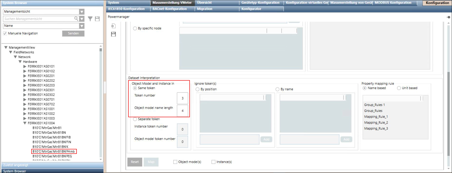 - In diesem Szenario ist die Token-Nummer 3; zählen Sie 3 Zeichenfolgen. B10 ist Zeichenfolge 1 und CI ist Zeichenfolge 2 und die dritte Zeichenfolge ist MtrGas. Da die Token-Nummer 3 lautet, werden sowohl der Objektmodellname als auch der Instanzname aus derselben dritten Zeichenfolge MtrGas erstellt. Da die Objektmodell-Namenslänge 4 beträgt, hat der Objektmodellname 4 Zeichen (MtrG), und der Instanzname ist die vollständige Zeichenfolge MtrGas.