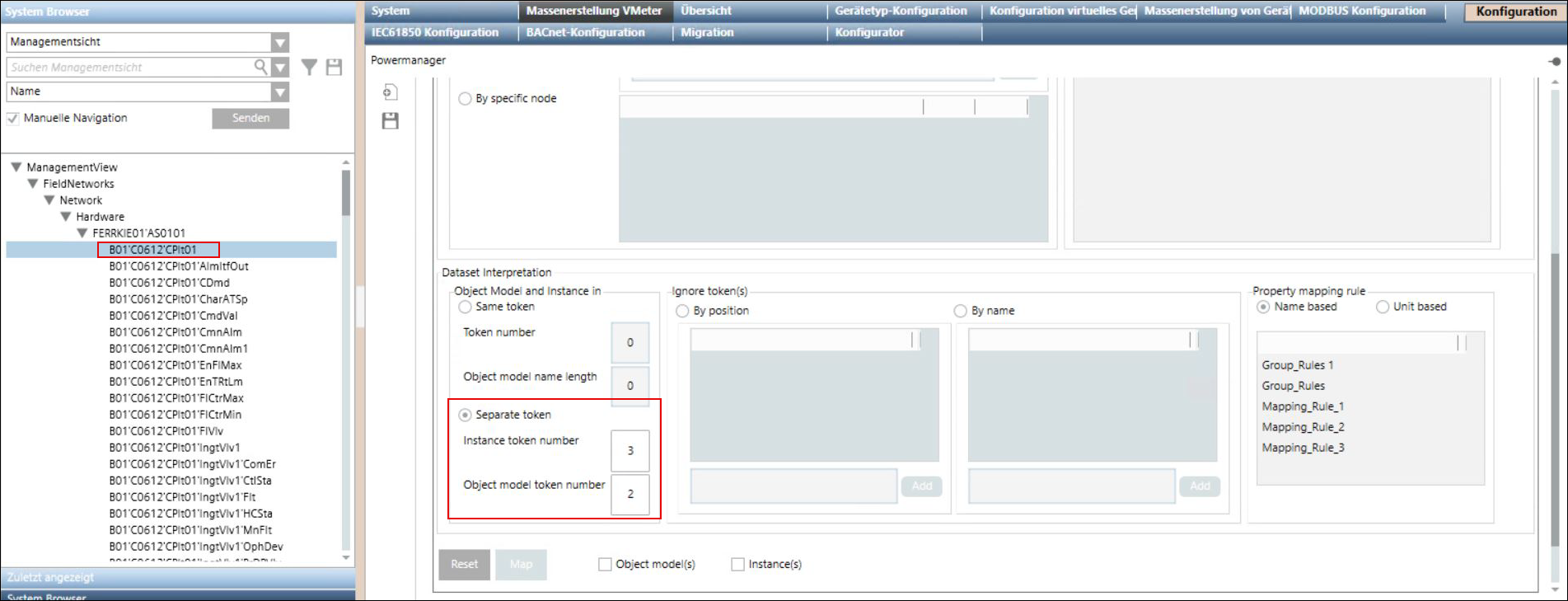 - Beispiel: Sie haben den Knoten B01'C0612'CPlt01'CDmd und haben als Instanz-Token-Nummer 3 sowie als Objektmodell-Token-Nummer 2 angegeben.