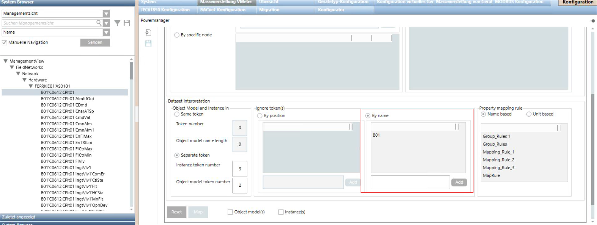 Wählen Sie eine namens- oder einheitenbasierte Eigenschaftenzuordnungsregel aus, um die Objekteigenschaften zuzuordnen. Die Eigenschaftenzuordnungsregeln werden in den Regeln für den Massenimport virtueller Geräte erstellt. (Siehe Regeln für den Massenimport virtueller Geräte definieren).