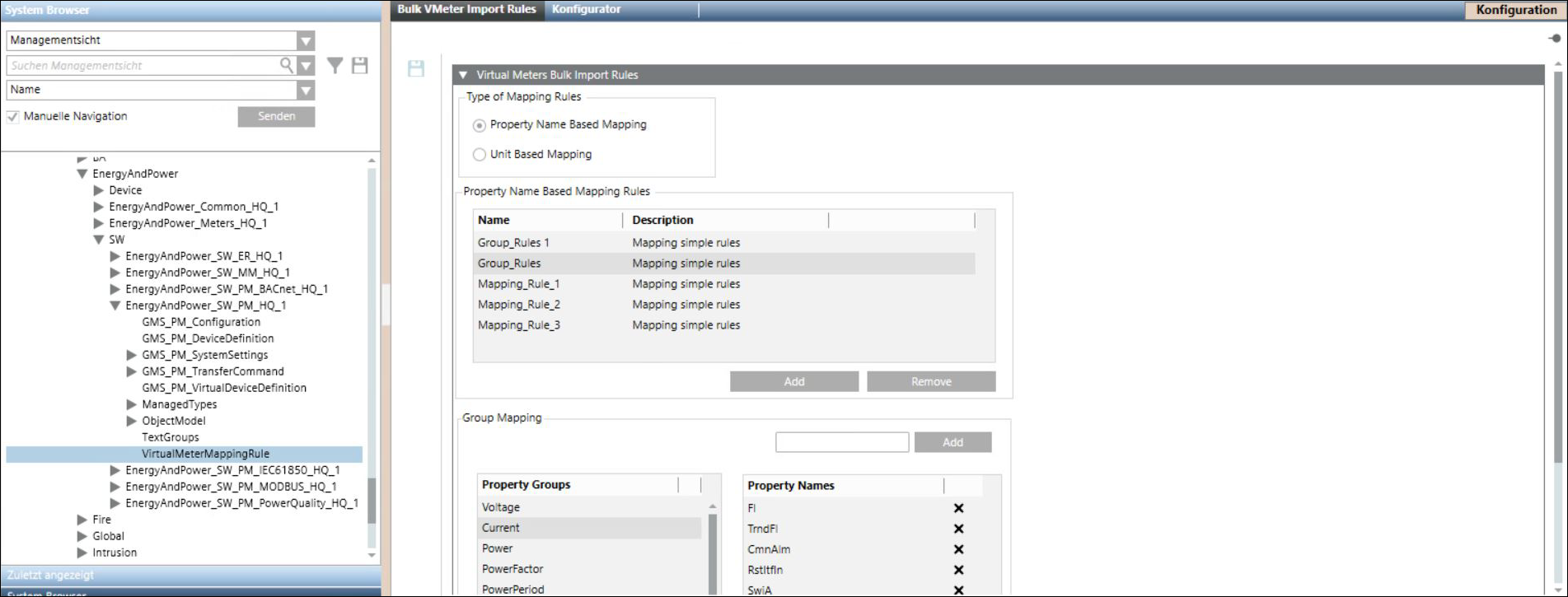 Der Expander Regeln für den Massenimport virtueller Geräte bietet Optionen zum Definieren von Eigenschaftenzuordnungsregeln, um den System Browser-Knoten Powermanager-Geräten zuzuordnen. Es gibt zwei Arten von Zuordnungsregeln: Eigenschaftsnamensbasierte Zuordnung und Einheitenbasierte Zuordnung. Um eine Regelzuordnungsdatei für auf Eigenschaftsnamen basierende Regeln zu erstellen, wählen Sie mithilfe der Bildlaufleiste die Eigenschaftsgruppe aus und ziehen Sie den System Browser-Knoten per Drag & Drop auf die ausgewählte Eigenschaftsgruppe. Um eine Regelzuordnungsdatei für einheitenbasierte Regeln zu erstellen, wählen Sie mithilfe der Bildlaufleiste die Eigenschaftsgruppe aus und fügen Sie eine Einheit hinzu, um sie der ausgewählten Eigenschaftsgruppe zuzuordnen.