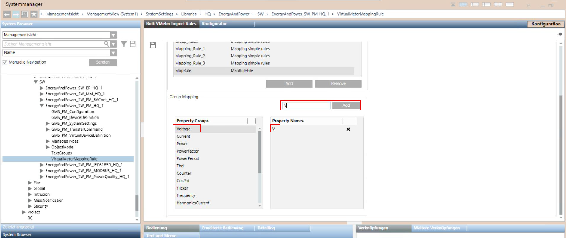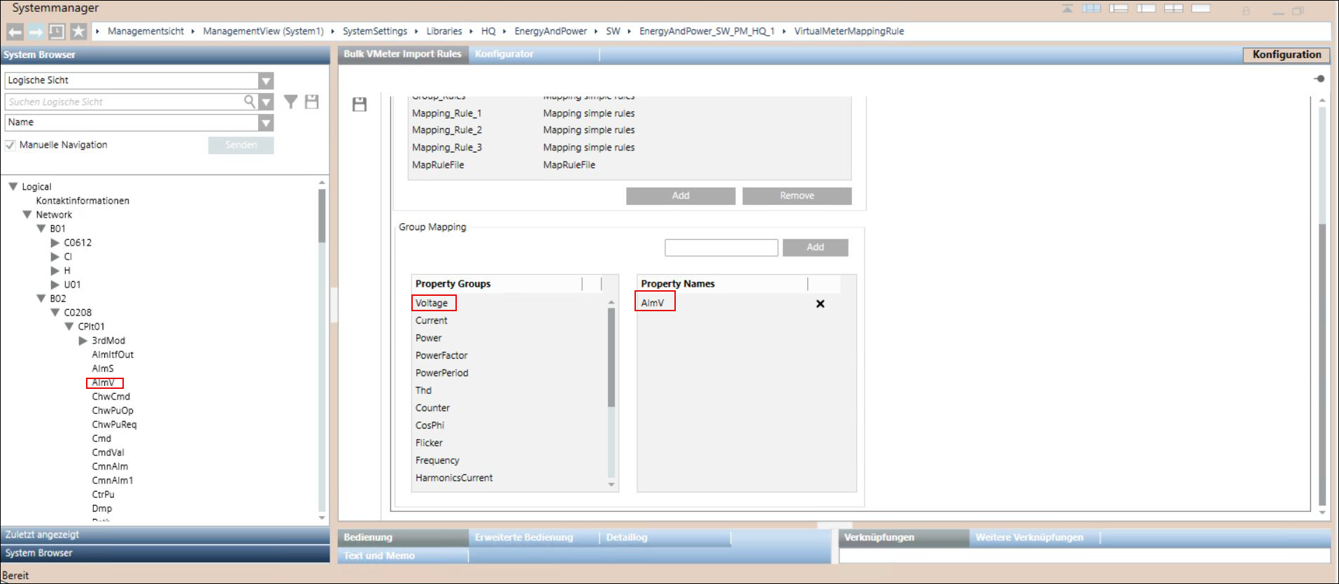 Um den Knoten im System Browser der ausgewählten Eigenschaftsgruppe zuzuordnen, ziehen Sie den Knoten per Drag & Drop auf die ausgewählte Eigenschaftsgruppe. Der Name des Knotens wird im Bereich Eigenschaftsnamen angezeigt. Beispiel: Sie haben über die Bildlaufleiste Spannung als Eigenschaftsgruppe ausgewählt und möchten den Knoten AlmV im System Browser der Eigenschaftsgruppe Spannung zuordnen. Dazu ziehen Sie den Knoten AlmV per Drag & Drop auf die Eigenschaftsgruppe Spannung. Im Abschnitt Eigenschaftsnamen wird der Knoten AlmV angezeigt.