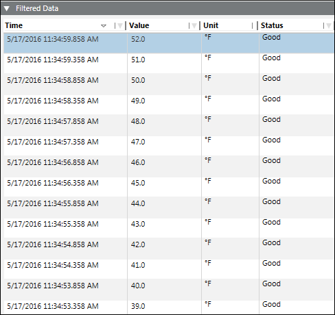 The trend information such as date/time, value, status, and unit information pertaining to only a single trended property displays in a tabular form in the Filtered Data section.